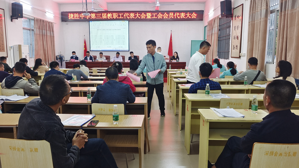正式会议第二次会议通过《捷胜中学第三届教育工会委员会选举办法》、“三员”名单。在“三员”的主持下,选举捷胜中学第三届工会委员会,选举过程规范有序,选举结果公开透明、公平公正,经过监票、投票、计票等严格程序,当场公布了选举结果。参加第二次会议的32名工会会员代表以无记名投票的方式选举产生了新一届工会主席、副主席和委员。并通过学校工作报告、学校财务工作报告以及《捷胜中学教育工会经费收支使用实施方案》(暂行)。