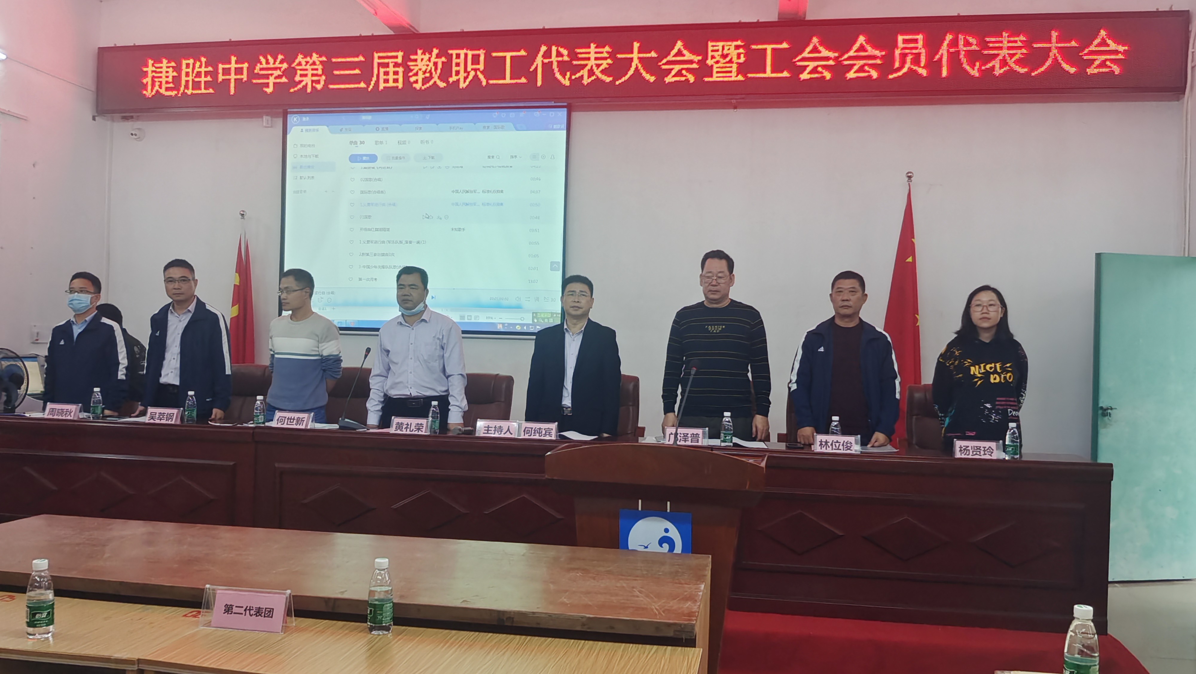 汕尾市城区捷胜中学第三届教职工代表大会暨工会会员代表大会在大会筹备领导小组精心筹备和全体代表的共同努力下,于2022年11月3日下午隆重召开。大会分为预备会议和正式会议。预备会议由上一届工会主席林位俊同志主持,会议审议通过《教代会筹备工作报告》、《教代会代表资格审查报告》,提名通过教代会主席名单,宣布教代会分组名单以及通过教代会议程。
