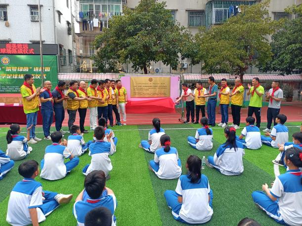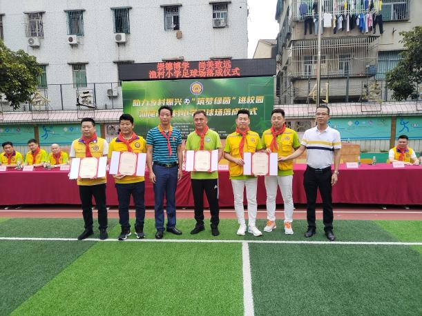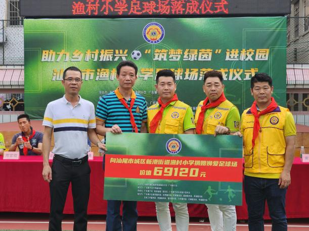 “乡村振兴,筑梦绿茵进校园”渔村小学足球场改建由广东狮子会天亮服务队2022-2023年度队长詹永萍牵头,广东狮子会筑梦绿茵委员会指导,感召多支联合友队共同出资(7万元)捐建。2022年9月开始筹划,在众多热心会员共同努力下筹集资金,并着手改建施工,如期顺利通过验收,交付使用。