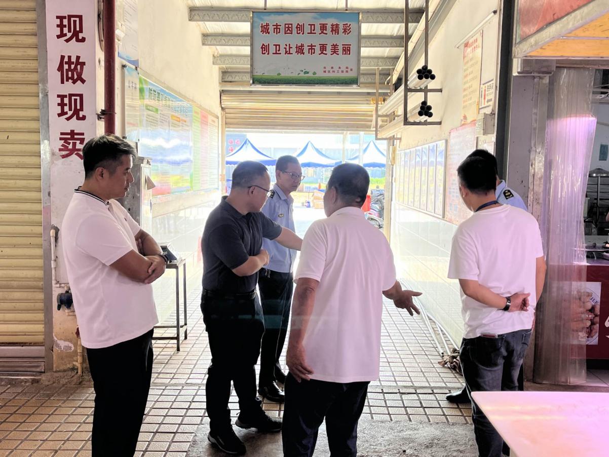 以农贸市场和食品生产经营单位为核心防控阵地,层层压实主体责任,全方位筑牢安全防线。在农贸市场管控上,实现“五关齐守”:一是宣传引导关,通过张贴海报、循环播放语音、电子屏滚动标语等方式,营造全员防控的浓厚氛围;二是设施保障关,督促市场方在市场下水道口加装防蚊闸,在门口配备防蚊喷雾并张贴使用提示,完善防疫硬件设施;三是日常保洁关,要求市场营业期间至少配备1名佩戴红袖章的专职保洁员,每小时开展一次常态化保洁,每日休市后全面清洗,按规范开展专业消杀;四是隐患排查关,重点对过道、泡沫箱、闲置瓶罐等易积水区域及污水排放情况进行细致排查,并全面清理长期未经营摊位,发现问题立行立改;五是台账管理关,督促业主建立健全每日清洗消杀台账,确保登记信息真实完整、有据可查。在食品生产经营单位监管上,由专项整治组按片区开展精准督导,督促经营者严格落实蚊媒防控和卫生管理要求,定期组织环境卫生大扫除与孳生地清理;深入餐饮单位前厅后厨,重点检查“三防”设施配备与使用情况,从源头遏制病媒生物滋生。