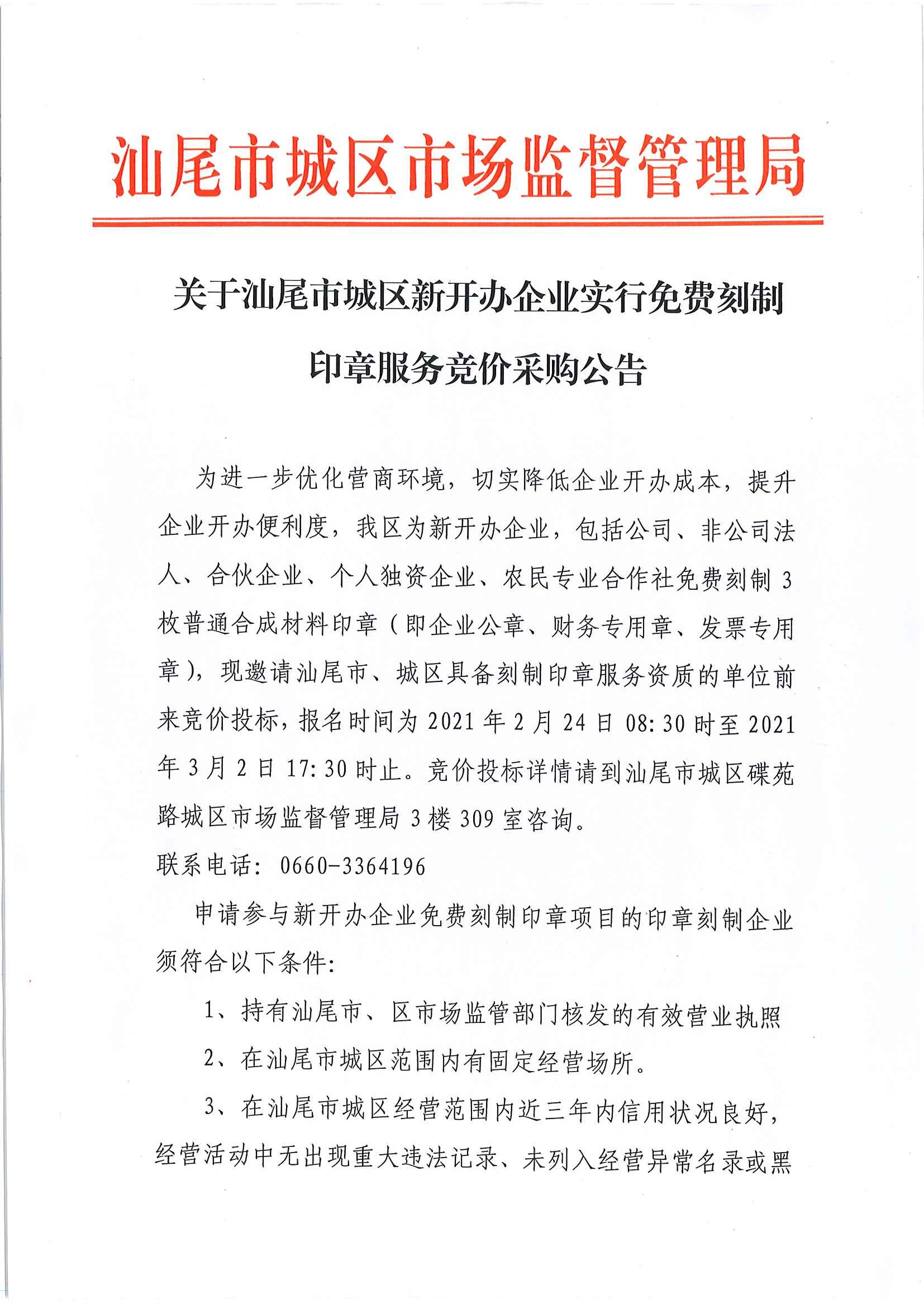 关于汕尾市城区新开办企业实行免费刻制印章服务竞价采购公告